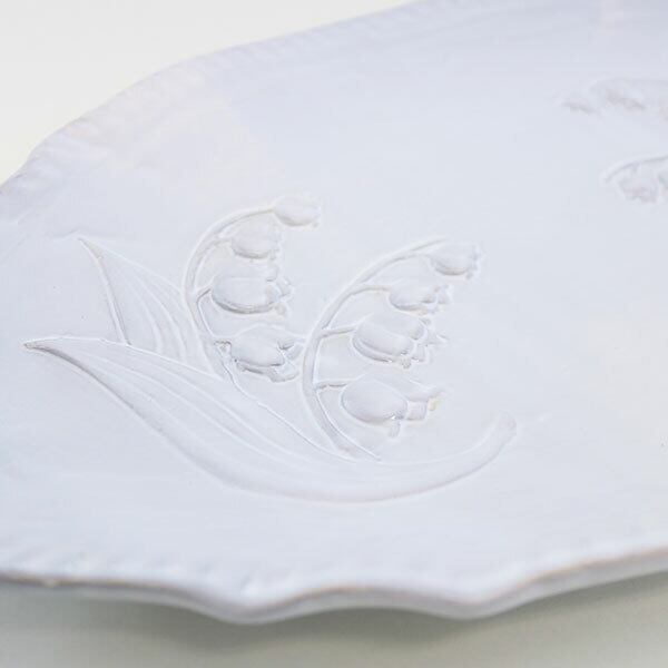 鈴蘭のモチーフがアクセント、ムラのある釉薬の仕上げを施しており、アンティークのような風合いです。