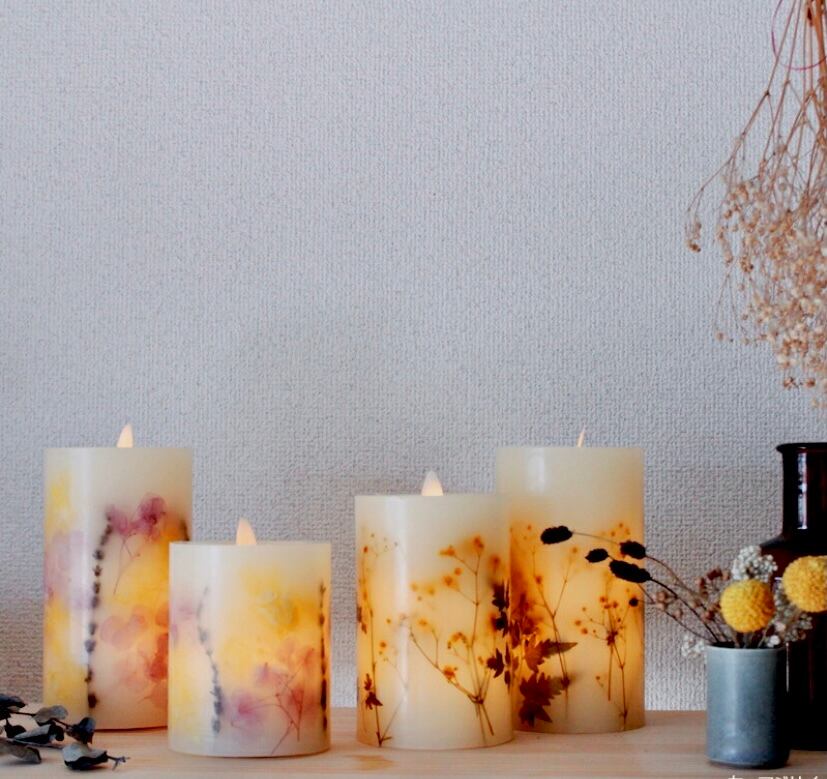 光に透ける押し花が美しいです。キャンドルから香るアロマにも癒されます。